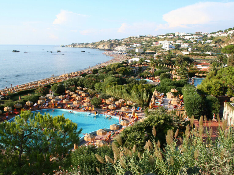 la baia di San Montano. Un esperienza unica immersa nel verde florido della vegetazione del parco, nelle sue piscine termali e calde, e la sua spiaggia con sabbia bianca e fondale sempre basso, fanno del parco del negombo un